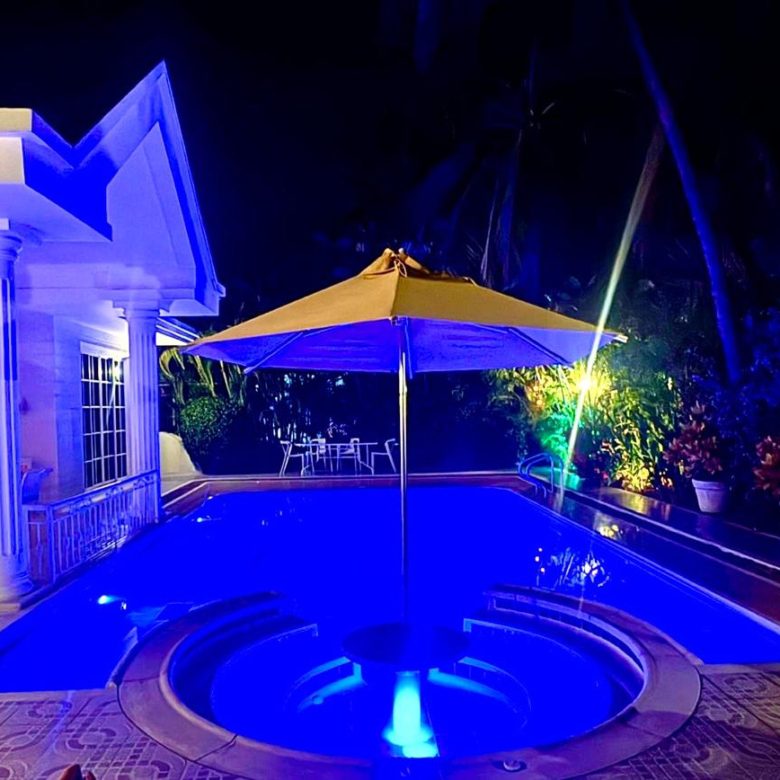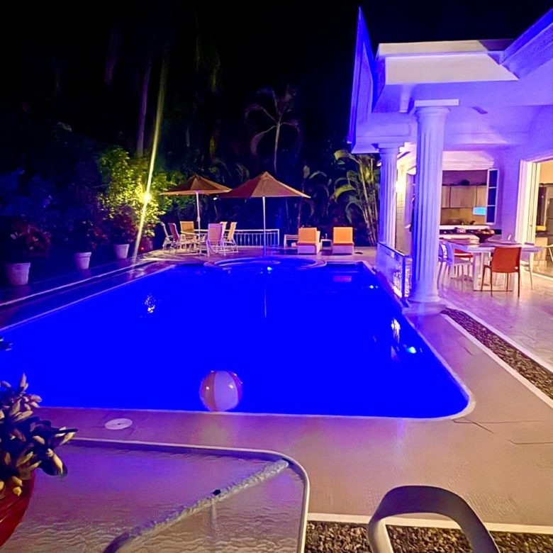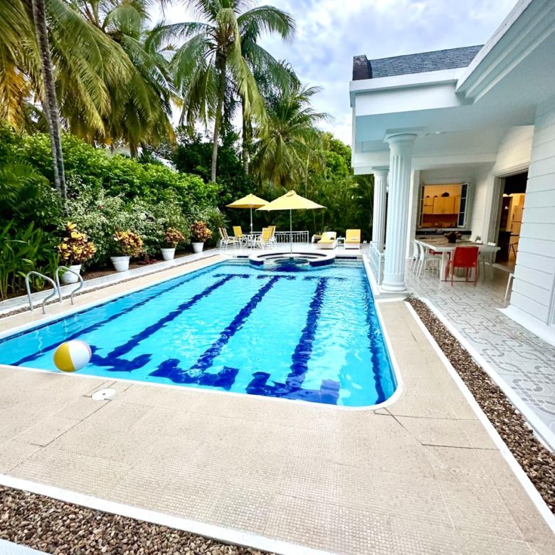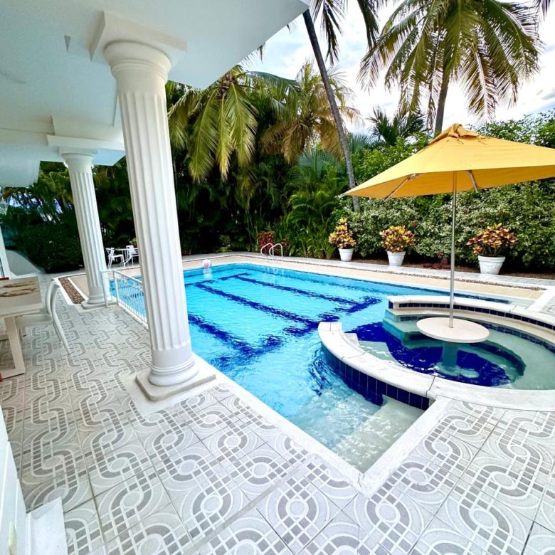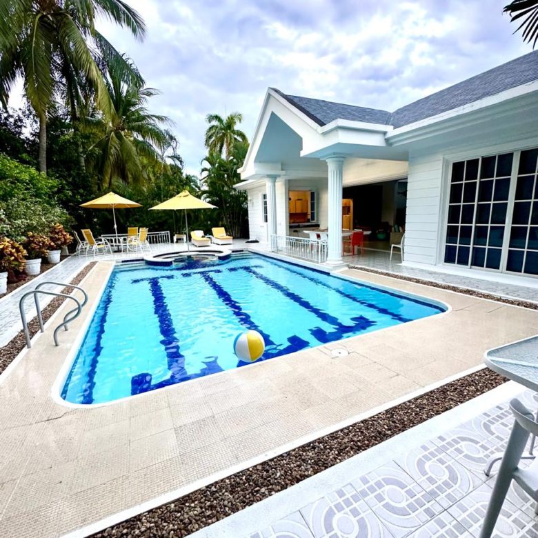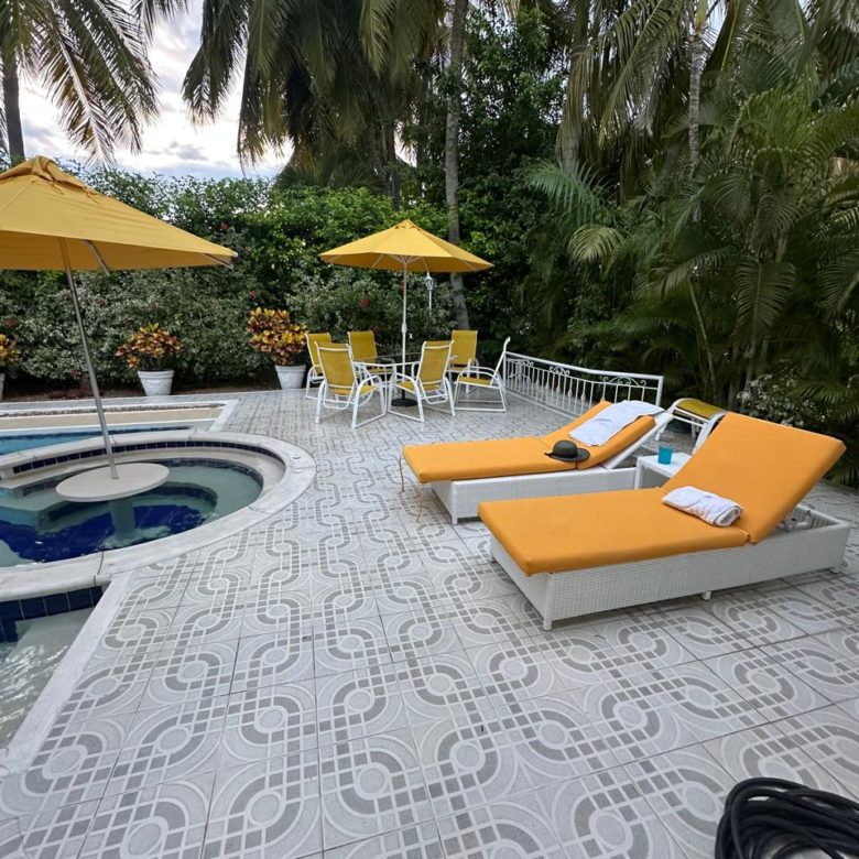 Piscina privada y jacuzzi, sillas asoleadoras.